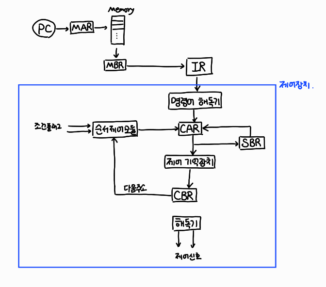 - 제어 주소 레지스터 (Control Address Register : CAR) : 다음에 실행할 마이크로명령어의 주소를 저장하는 레지스터이며, 주소는 제어 기억장치의 특정 위치를 의미한다.