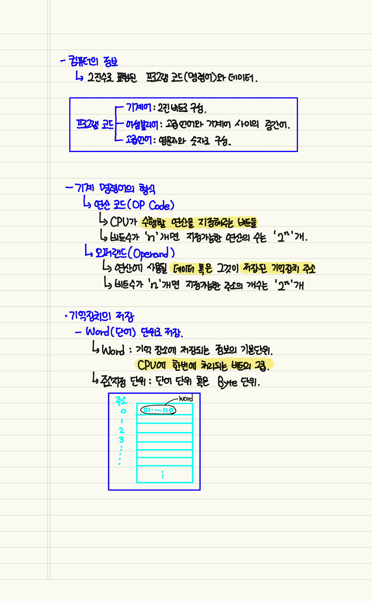 컴퓨터의 정보는 2진수 비트로 표현하며 명령어( 프로그램 코드 )와 데이터로 이루어진다.